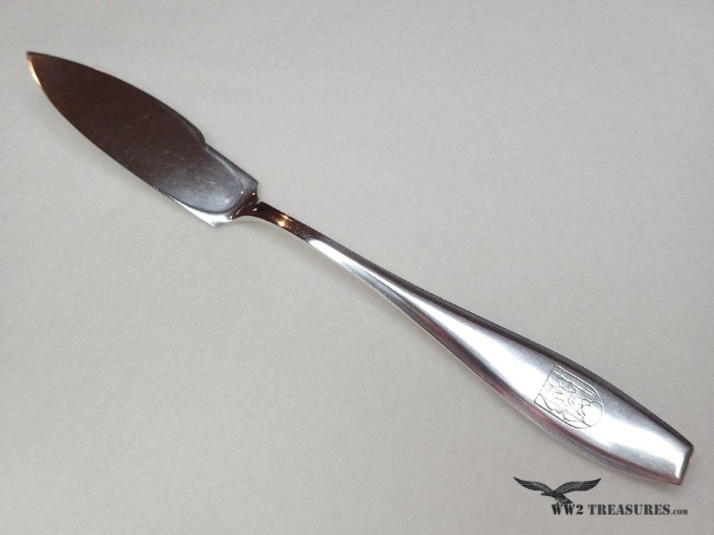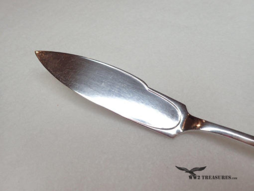 Here’s a very rare and unique piece of silverware made for the officers at the Wildflecken training camp. Plated silverware made by Wellner. Stamped “Offizierheim (Officers) Wildflecken” and a detailed Wildflecken crest on the front side. This is the first time this pattern of flatware has come across my desk.