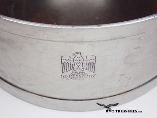 Here’s an extremely rare Reich Chancellery Sauce Pan made by WMF. It is roll stamped with the party eagle clutching an oak wreath with a swastika. The “R” and “K” flank the sides of the wreath. In addition, the maker mark and cookware line “WMF Cromargan” is stamped to the right of the handle. It is made of stainless steel and chrome with a heavy cast iron base inlay. It’s a very stout quality made pan weighing in at 10 1/2 pounds. It measures 22 1/2″ long from handle to handle and the pans diameter is 10 1/2″ by 5 1/2″ deep. Reich Chancellery artifacts like this pan are extremely rare.